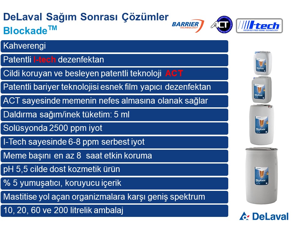 DeLaval'in I-tech (Serbest İyot Teknolojisi) ve ACT (Gelişmiş Yumuşatma Teknolojisi) kullanarak geliştirdiği iyotlu meme başı daldırma dezenfektanı, kullanıma hazır bir formda sunulur. Bu dezenfektan, meme başlarının etkili bir şekilde dezenfekte edilmesini sağlar ve aynı zamanda deriyi düzleştirir.