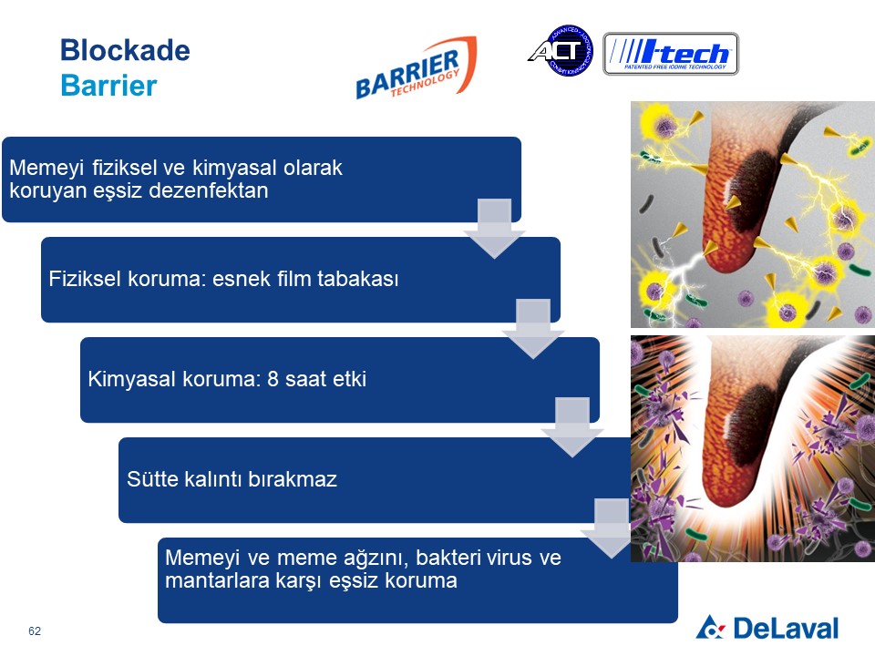 Bu, kullanıma hazır, film oluşturan iyotlu meme başı daldırma dezenfektanı, I-tech (Serbest İyot Teknolojisi) ve ACT’yi (Gelişmiş Yumuşatma Teknolojisi) kullanır. Meme başlarını en uygun şekilde dezenfekte eder ve deriyi düzleştirir. Özellikle sağımdan sonra, çamur ve sıvı gübreden gelen çevresel bakterilerin meme başı kanalına girmesini önlemeye yardım etmek için ince, elastik bir tabaka oluşturur. Her sağımdan sonra meme başına daldırma olarak uygulanır.-